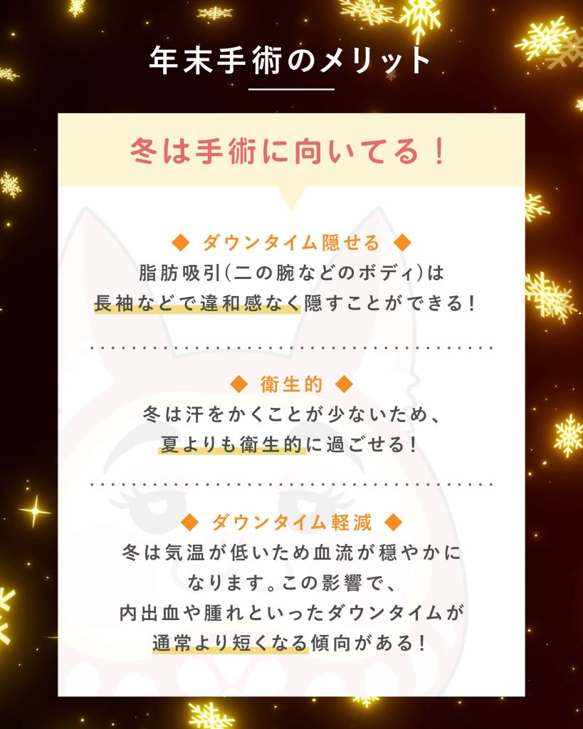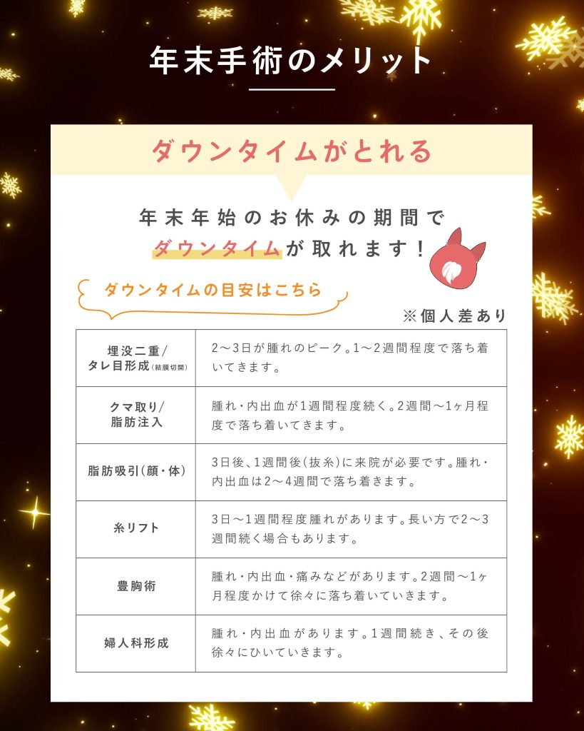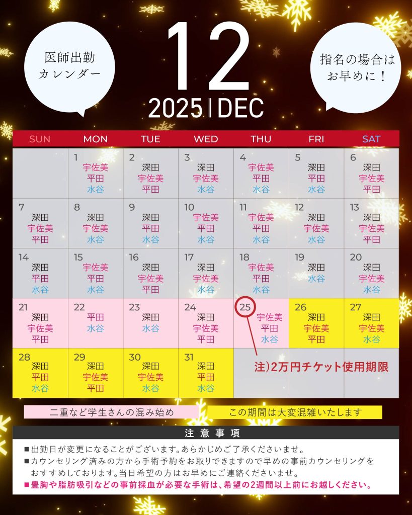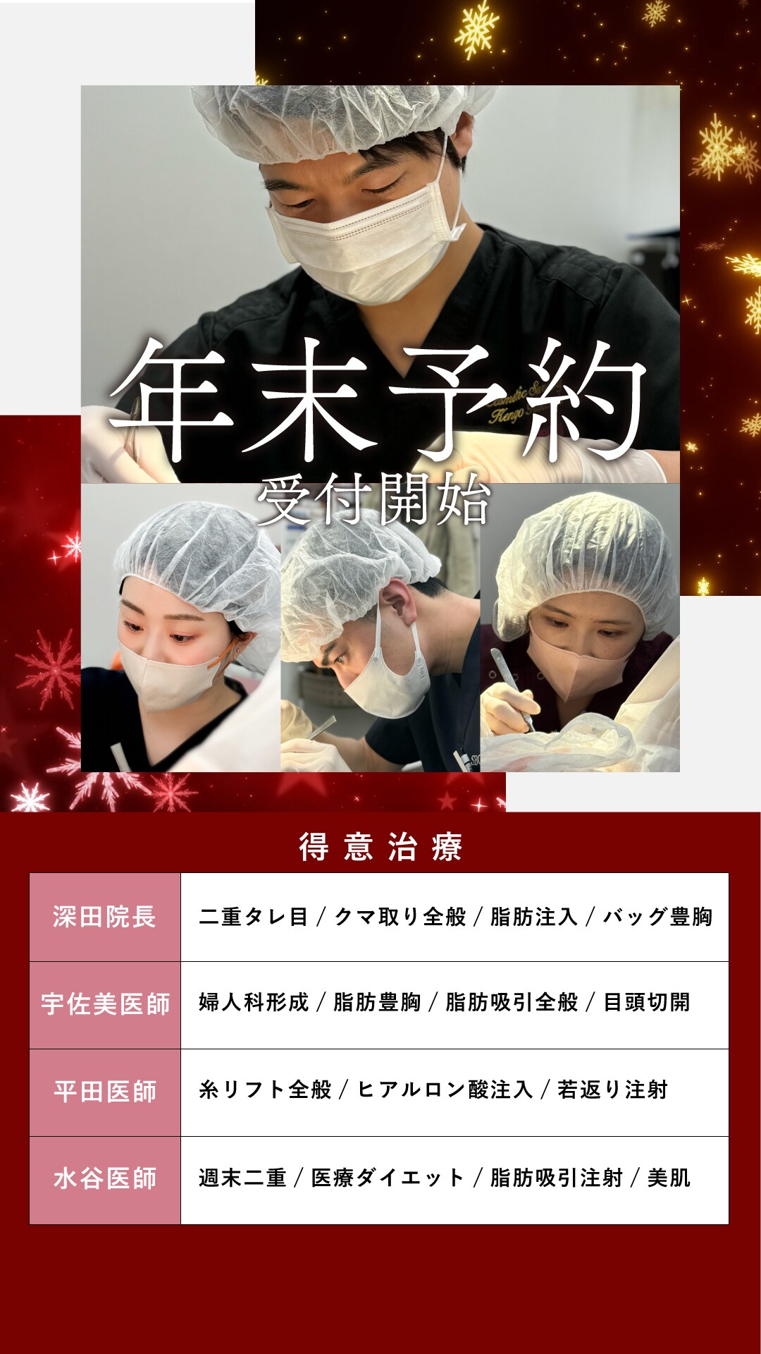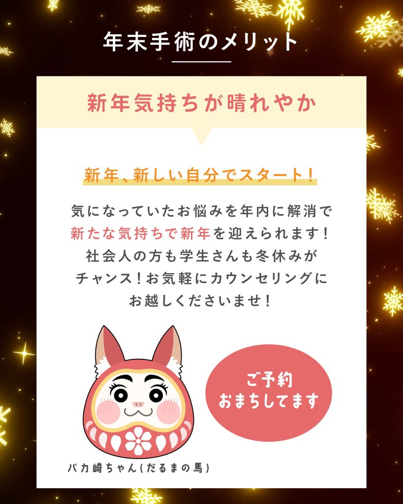 また、年末年始施術は相談当日のご案内が確約できかねますので、施術希望日がある際は前もって事前カウンセリングを受けた上で、年末に施術のみご予約を推奨しております。