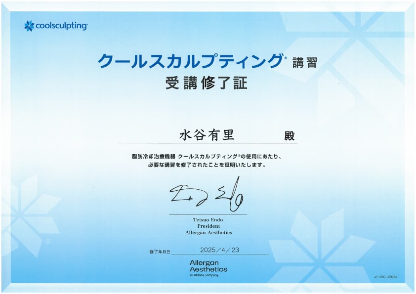 当院常勤の水谷医師も受けています。また水谷医師はアラガン社のクールスカルプティング講習も受講修了しております。