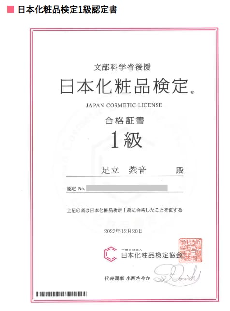 文部科学省後援の公的資格である『化粧品検定1級』を取得しています。