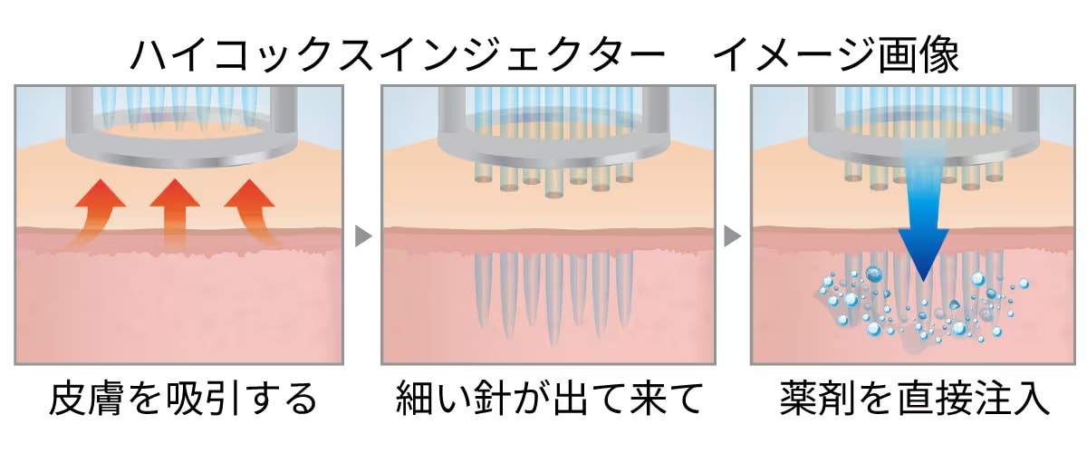 従来のハイコックスという機械と比較をして液漏れが少なく、無駄なく薬剤を肌に注入することが可能です。