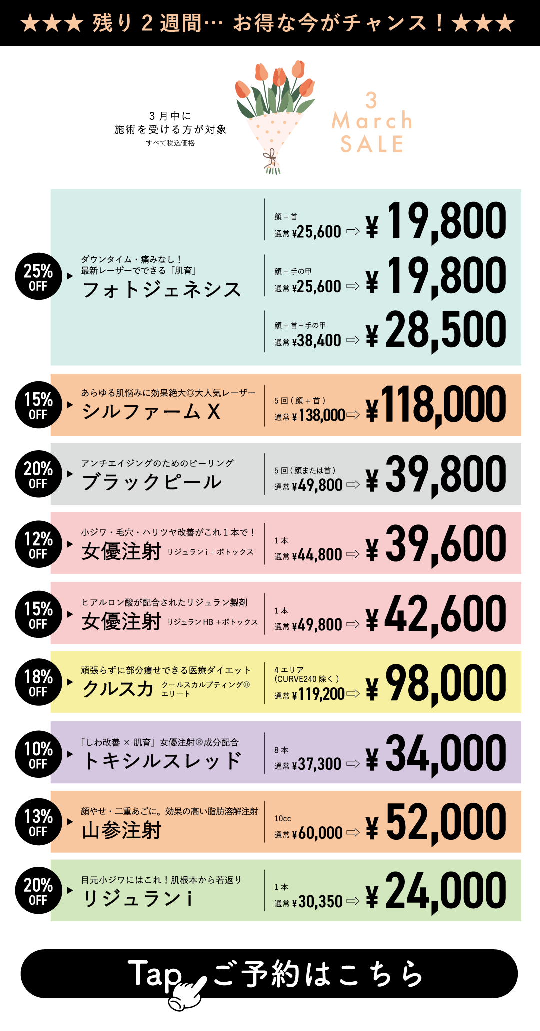 また、医療脱毛やシミ取り・医療ハイフ・美容皮膚科治療・ヒアルロン酸・ボトックス注射・ダイエット・AGA治療など、お手軽治療も充実!