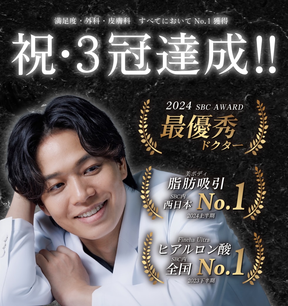 美容外科医としては珍しく「アフターフォロー」も手厚く、経過観察をしっかりと行っい、術後の不安な気持ちにもしっかり寄り添う姿勢がお客様から評価され、SBCドクター約500名の中から満足度No.1として【SBC AWARD最優秀ドクター】に選ばれました!