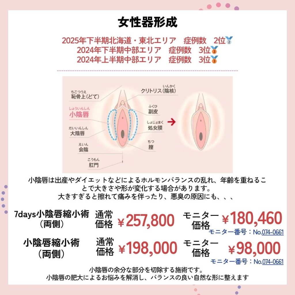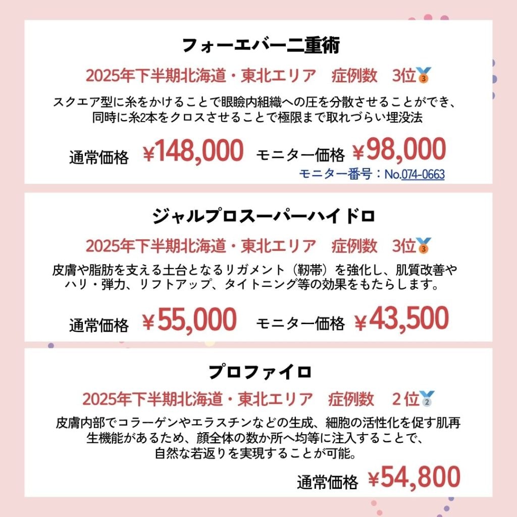 クマ取り、糸リフトなどの若返り、脂肪吸引などの医療痩身、女性のお悩みに寄り添った婦人科形成、豊胸、医療脱毛や医療ハイフを始めとする医療レーザー、美容皮膚科治療など幅広い施術を取り扱っています。