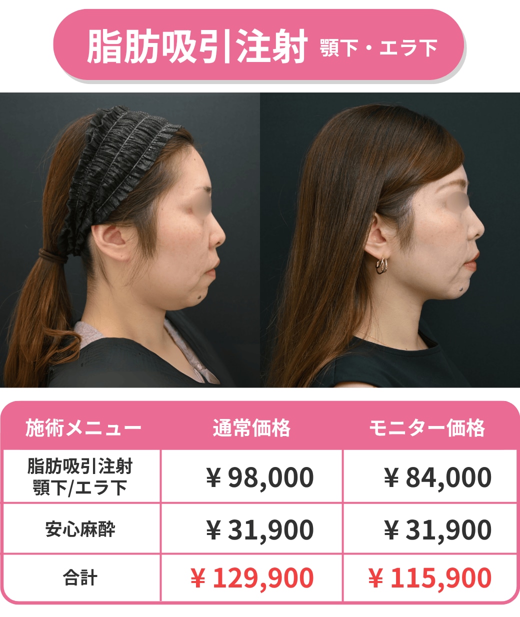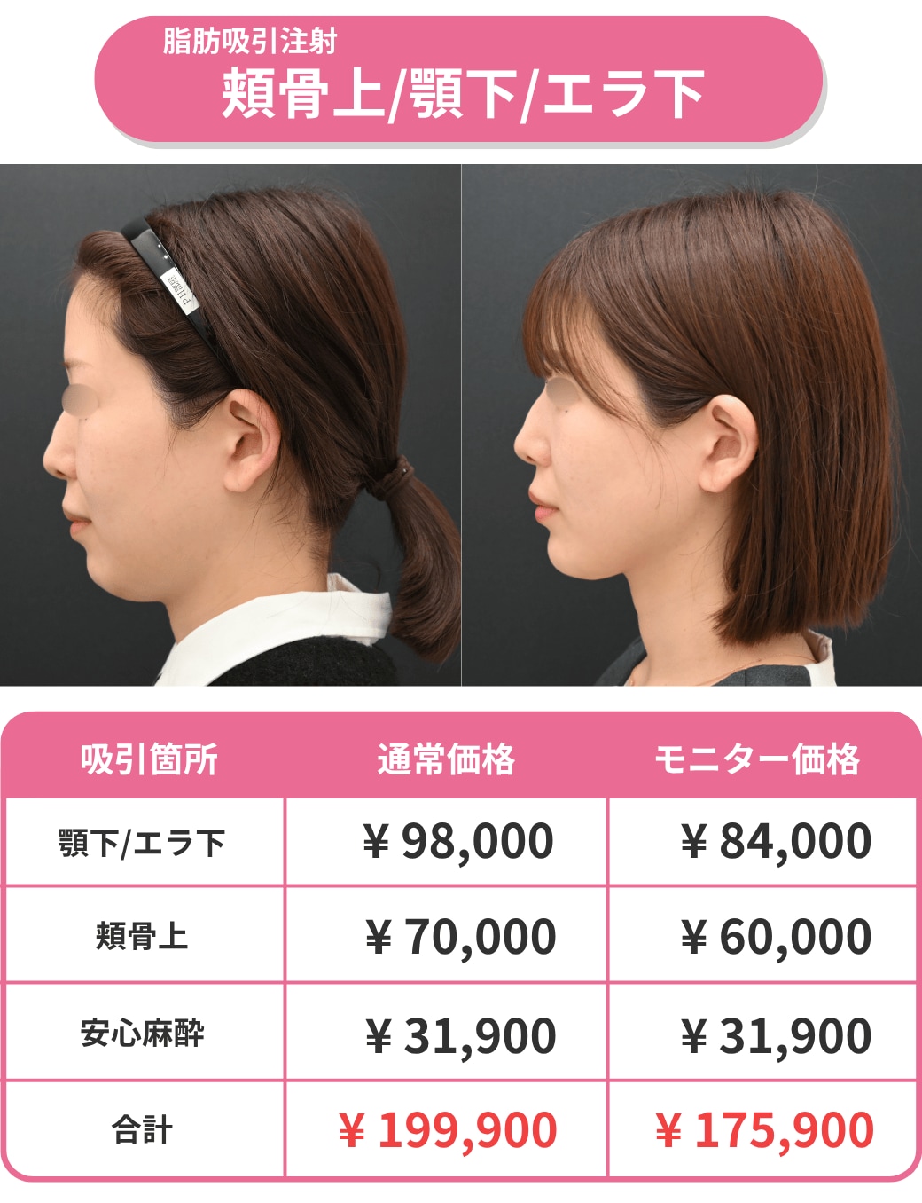 今回の方は顎下・エラ下・頬の脂肪吸引注射を行いました。顎下・エラ下では1週間ほど黄色い内出血が少し出ていましたが、目立つほどではありませんでした。