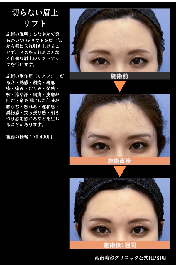 しなやかで柔らかいVOVリフトを眉上から入れ引き上げる事で、メスを入れることなく眉毛やまぶたを上げる事が出来ます。
