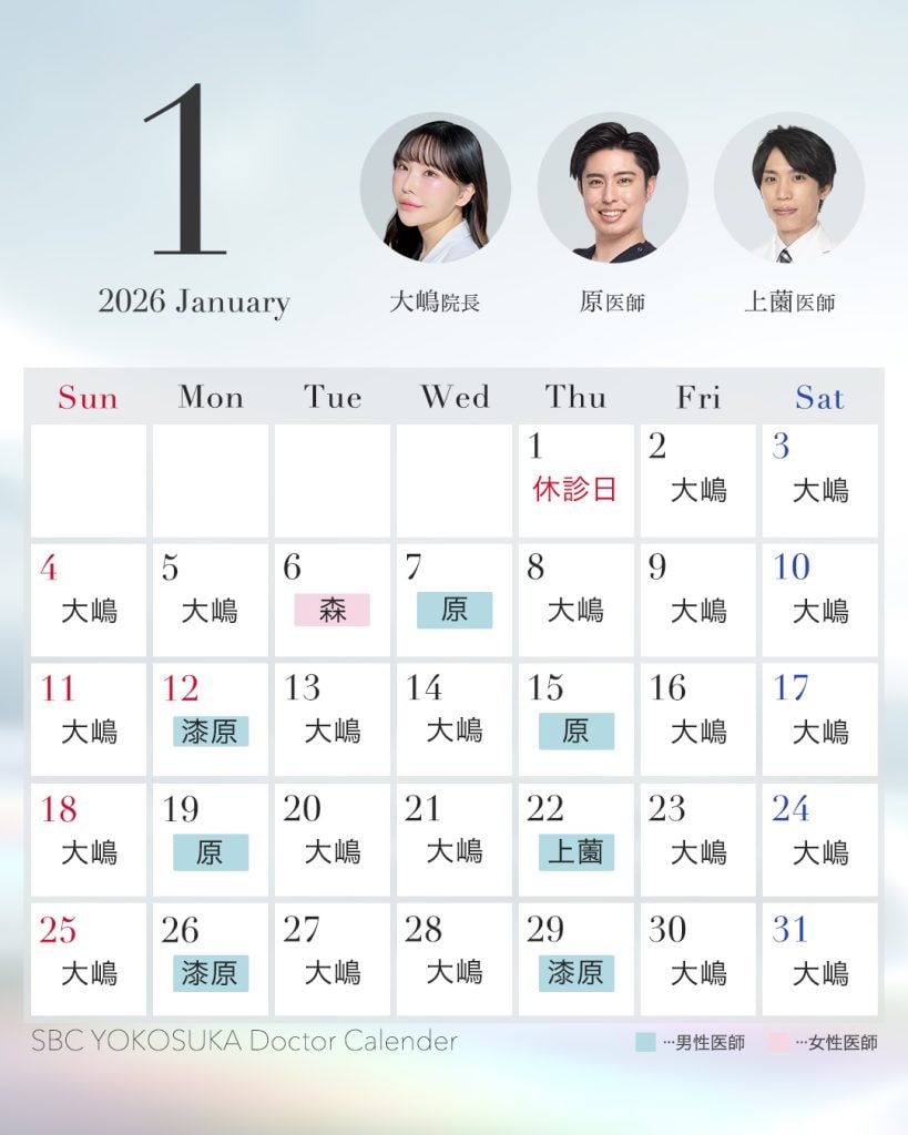 クリニック案内 神奈川県のクリニック 湘南美容クリニック 横須賀中央院 1月・2月 医師出勤カレンダー
