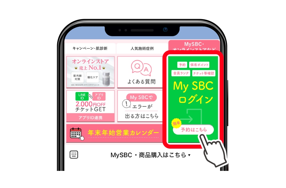 ブラウザまたは、SBC公式アプリからMy SBCにログイン。マイメニューから、予約したい施術メニューを選択。