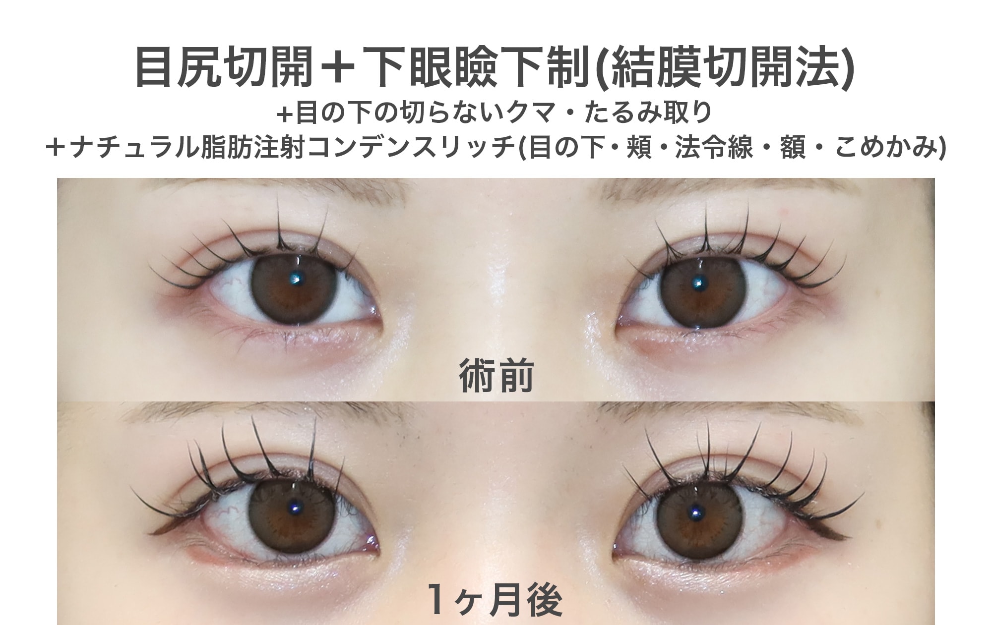 目の下の不要なたるみを取り除く「目の下のクマ取り」+「脂肪注入」だけでなく、高い技術力が必要とされる、脂肪注入が不要な「裏ハムラ法」も対応可能😊