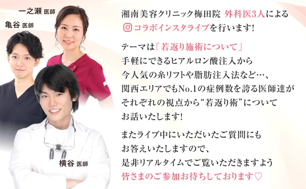 - 参加ご希望の方は当日、お手持ちのスマートフォンやパソコンから横谷医師のInstagramアカウント・大阪梅田院のInstagramアカウントをご確認の上、ライブ動画を視聴してください。(事前の参加お申込みは不要です)