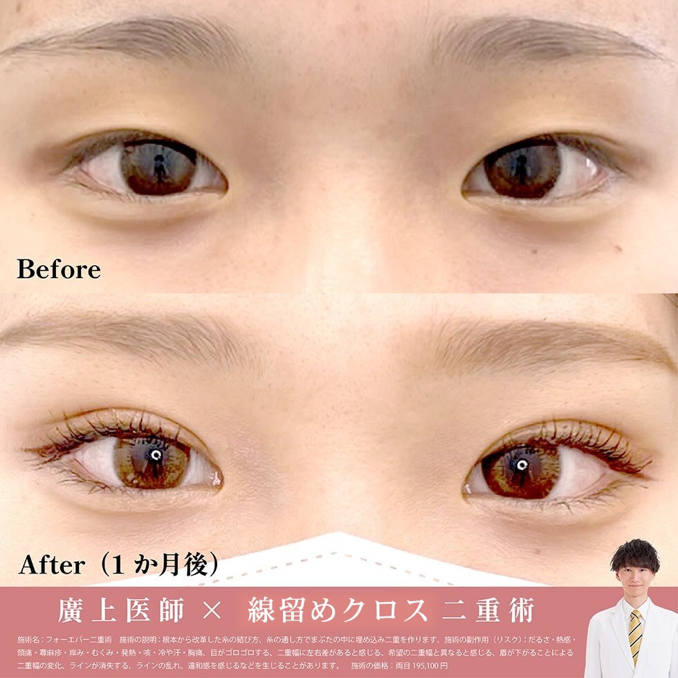 スクエア型に糸をかけることで眼瞼内組織への圧を分散させることができ、同時に糸2本をクロスさせることで極限まで取れづらい埋没法を実現しました。