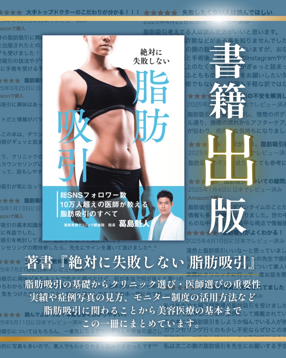 | 2024年12月27日 | 絶対に失敗しない 脂肪吸引 出版 圧倒的な症例数と総フォロワー数10万人超えの葛島魁人先生が、本書を通じて、注目の脂肪吸引について、必要な知識と正しい選択を提供し、読者が自信を持って新たな一歩を踏み出せるようサポート。