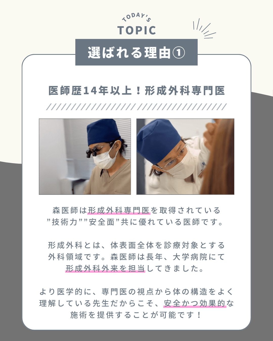 『切る方法を勧められたけど、どの先生がいいんだろう』『切るのは不安だけど、後戻りしにくい方法がいい』そういう方にこそ、形成外科専門医である私のカウンセリングを受けていただきたい、そう考えております。