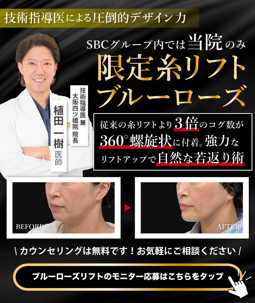 美容大国・韓国で選ばれ続けるブルーローズリフト。従来の糸リフトがさらにパワーアップしました。 従来の糸のコグ数は、1cmあたり4~5個に対し、ブルーローズリフトは12~15個と約3倍の圧倒的なコグ数。 特殊加工された革新的な糸構造が皮下組織に絡まり引き上げることで、劇的な引き上げ力を実現させました。 また、リフトアップ効果が従来の糸リフトに対し長期間持続するうえコグ数が多い為少ない本数で劇的にリフトアップを実現、尚且つダウンタイム軽減を図る事ができる最新リフトアップ治療です。 日本で取り扱いのあるクリニックはわずかで、SBCグループ内では技術指導医 兼 大阪四ツ橋院院長 植田医師のみ。 世界各国で学んだ最新技術を取り入れながらお痛み等の不安をできる限り取り除き、お客様のご希望に合わせデザインしていきます。 植田医師が導き出した「特殊固定法」は、お客様一人一人に合わせて強度を調整することが可能なので、かなり引き上げたい方はご相談ください! 従来の糸リフトでは満足できなかった方や、長期間のダウンタイムは取れないがしっかりと持続・効果を求める方におすすめなブルーローズリフトをご体感ください!