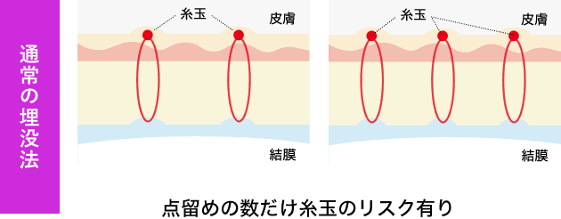 通常の埋没法では、点留めの数だけ糸玉が表面化するリスクがありますが、クイックコスメティークNeoでは表面に針を通さないので、糸玉のリスクがありません。
