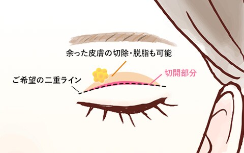 二重切開法とは、デザインしたラインに沿ってメスを入れ、皮膚を切開して強固な二重ラインを作り上げる二重整形の方法です。