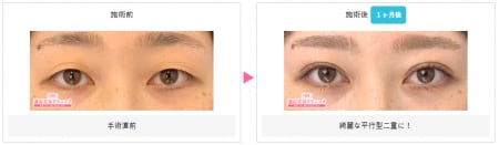 「線留めクロス二重術」「クイックコスメティーク・ダブルNeo」「湘南二重術」を用い、きれいな平行型二重を実現しました。