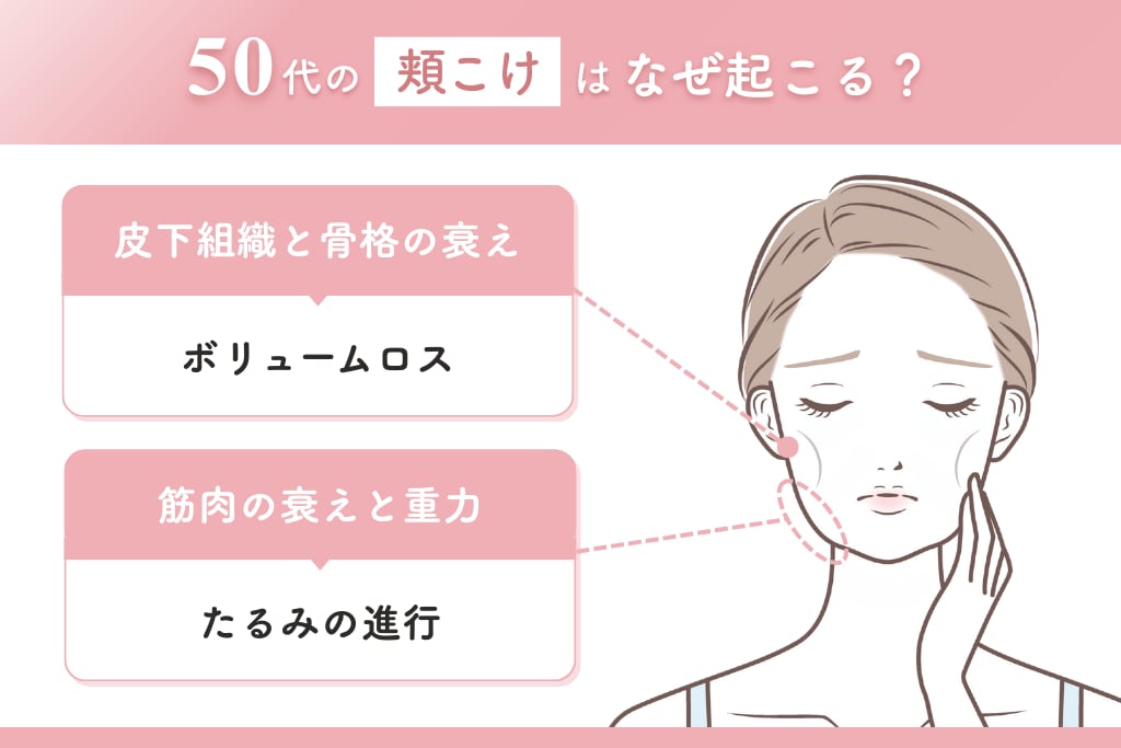 50代で頬こけが進行し、やつれた印象を与えるのは、単一の原因ではありません。顔の土台や構造、そして皮膚を構成するすべての要素に、加齢による複合的な変化が起こるためです。