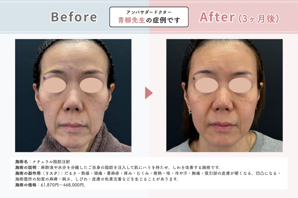 この施術は、一度脂肪が定着すれば効果が半永久的に続きます。また、自己細胞を使うため安全性が高く、加齢により失われた水分の回復も期待できるので、自然体で若々しい表情を取り戻せるのもメリットです。