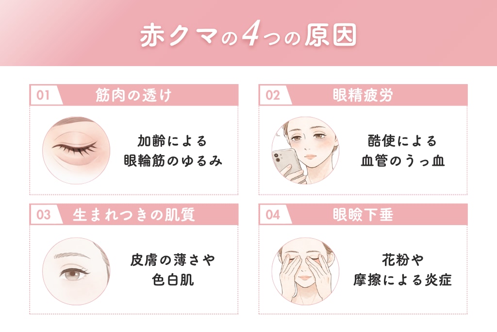 日々の習慣や年齢による構造変化など、赤クマが生まれる具体的な原因を4つに分けて見ていきましょう。