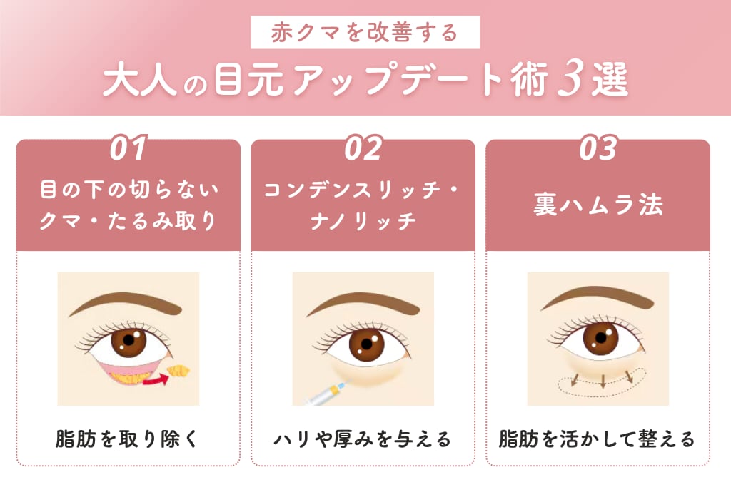 ただし、赤クマは構造的な要因が関わるケースも多く、セルフケアだけでの改善には限界がある点も理解しておきましょう。