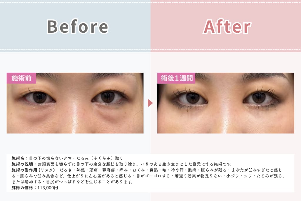 | 目の下の切らないクマ・たるみ取り | 目袋のふくらみが目立つ方 | まぶたの裏側から余分な脂肪を除去 |
