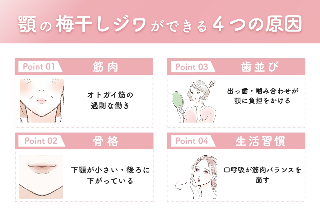 さらに会話や食事のたびに口を閉じる動作が繰り返されると、筋肉の緊張が定着。こわばった筋肉に表面の皮膚が引っ張られ、梅干しジワとして目立ってきます。