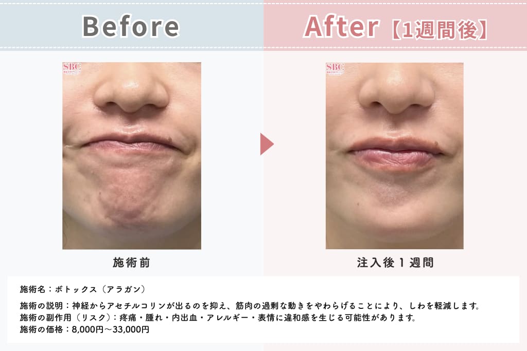 顎のしわだけでなく、「いつも口元が下がっていて、怒っているように見られる」などのお悩みがある場合は、口角ボトックスとの組み合わせが適しています。