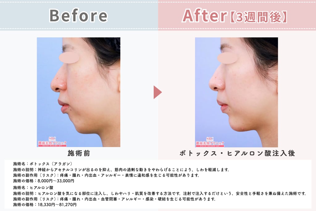 | ボトックス+ヒアルロン酸 | 顎が小さく、横顔のEラインも一緒に美しく整えたい方 |