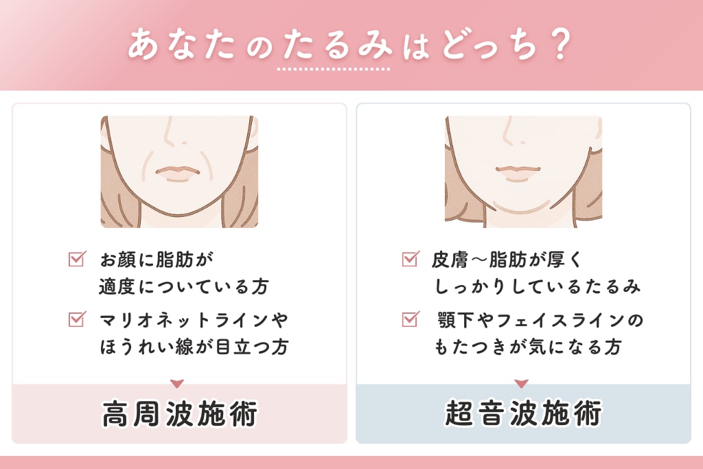 そのため、ご自身のたるみの「深さ」や「脂肪の厚み」といったタイプを見極めることが、最適な施術を選ぶ際のポイントです。