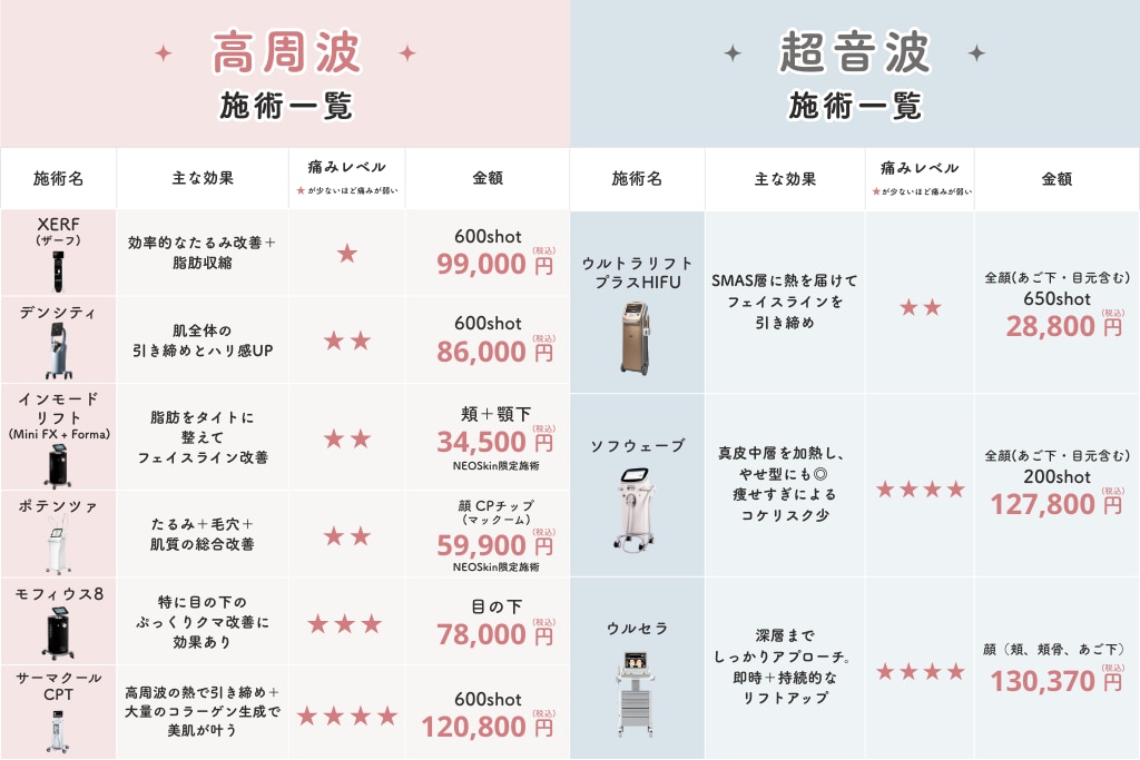 また、痛みの感じ方には個人差がありますが、高周波なら「XERF(ザーフ)」、超音波なら「ウルトラリフトプラスHIFU」が、痛みを最小限に抑えられておすすめです。痛みに弱い方や初めての方でも安心して受けられるでしょう。