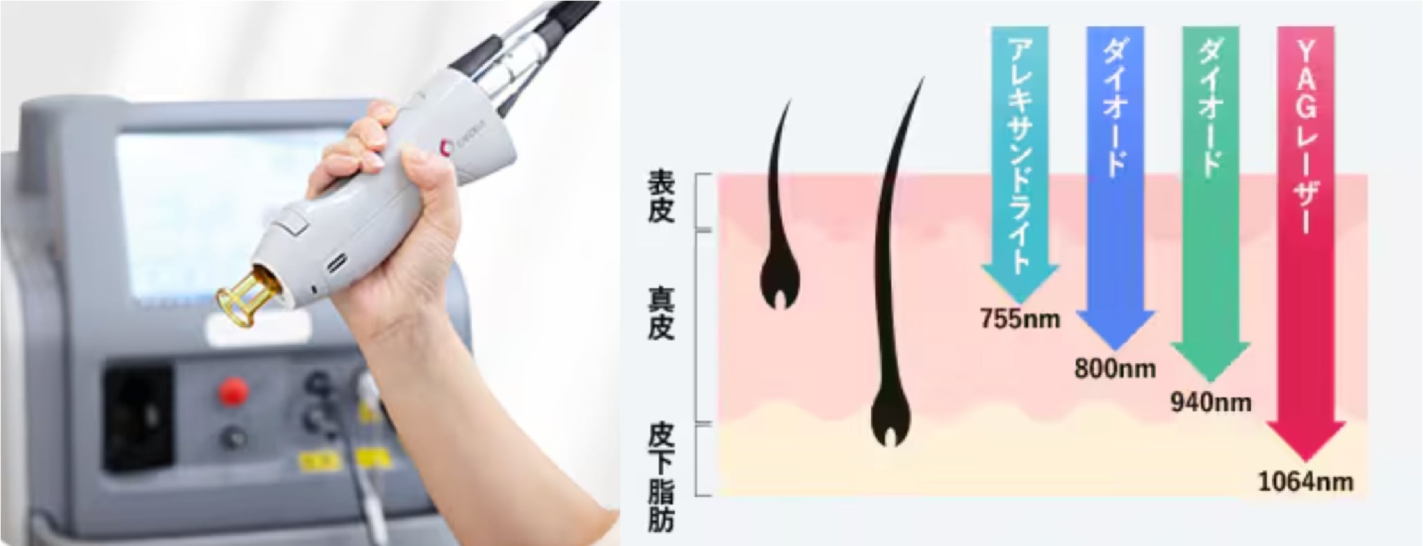 アレキサンドライトレーザーとYAGレーザーの異なる2波長を搭載しており、幅広い脱毛治療に対応することができます。