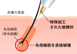 特殊な針を使用し皮膚表面にダメージを与えることなく、1本1本の毛を狙って毛母細胞を直接破壊。