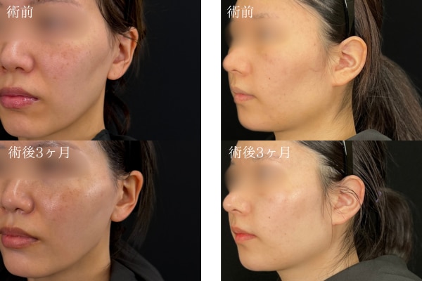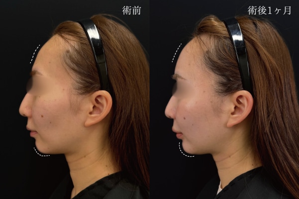 横から見ると、額(おでこ)の凹凸感がなくなり、女性らしい若々しい印象になりました。また、アゴの脂肪注入をしたことで、横顔の鼻先・唇・アゴ先を結んだ「Eライン」が綺麗になり、さらに輪郭が整いました。