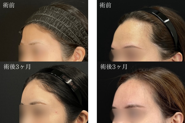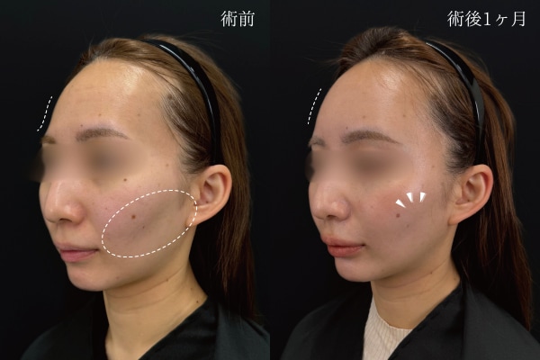 斜めから見ると、額(おでこ)に丸みが出たのがよく分かります。元々の骨格によってゴツゴツ感が目立ちやすい方もいますが、脂肪注入をすることで綺麗なつるんとした額(おでこ)になります。