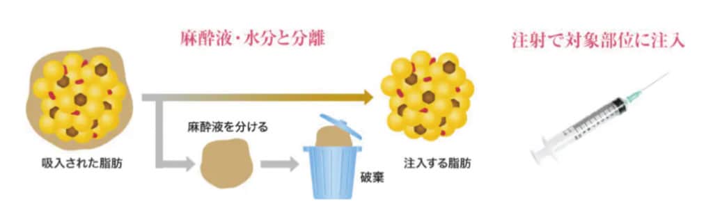 脂肪注入とは、ご自身の体の一部から採取した脂肪を、気になるお顔の部位に注入し、輪郭形成、若返りを目指す施術です。脂肪注入は大きく3つのステップで構成されます。