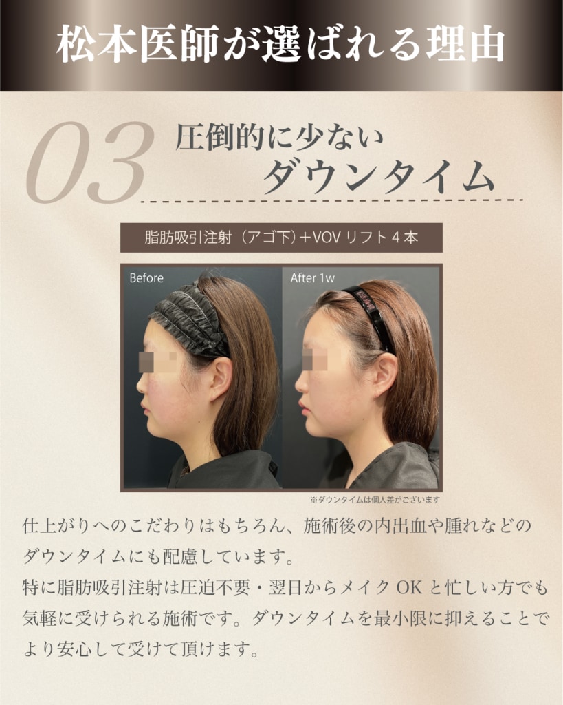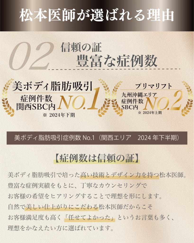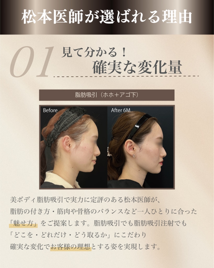 松本澪耶医師は脂肪吸引関西エリアNo.1の実績があり、圧倒的な症例数があります。特に小顔治療は多くのお客様から支持されており、とても高い満足度を得ています。