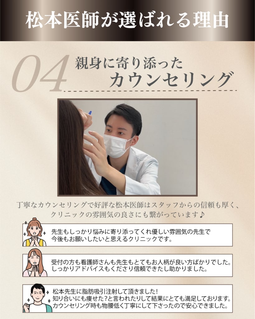 また、お客様へ丁寧に接する「人柄」は、「高圧的でなく安心できる先生」「優しく相談しやすい先生」というお声を多くいただいてます。