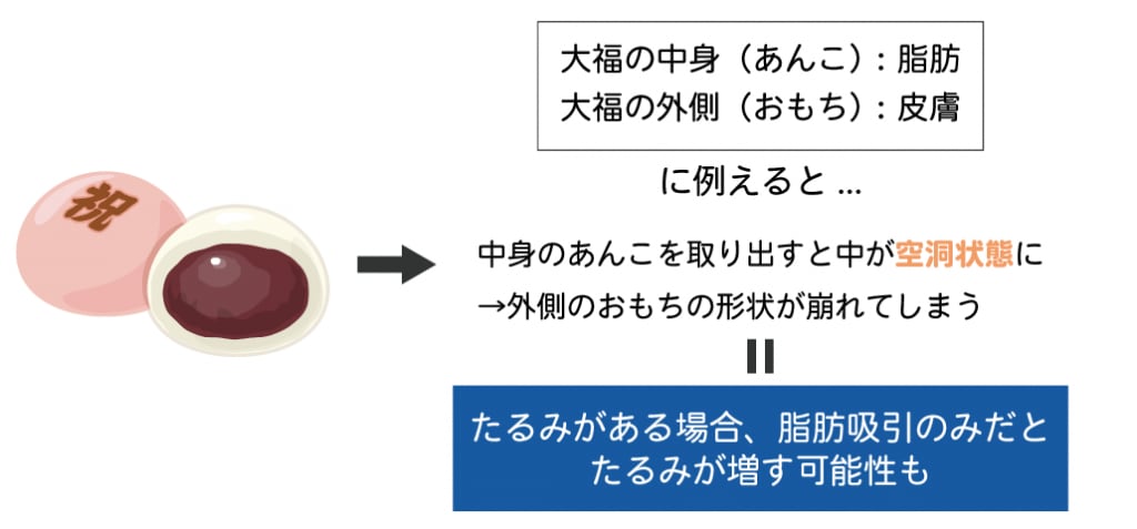 脂肪吸引で「二重あご・頬の脂肪(ボリューム)」を減らすと皮膚の余り(たるみ)が生じる可能性があります。特に脂肪量が多い方や皮膚の弾力が低下している方は、このたるみが小顔効果を妨げてしまうことがあります。
