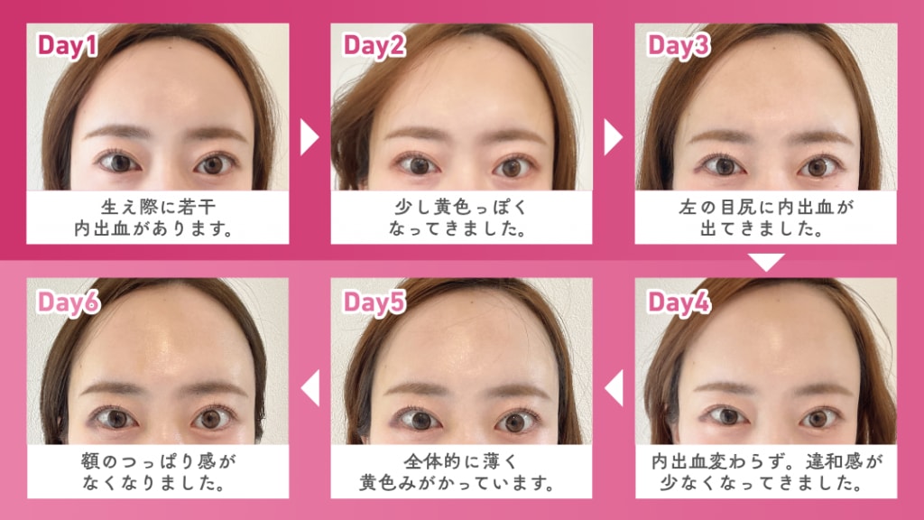 - 症状:4日目~5日目はまだむくみ感や内出血があることが多いです。内出血が青みが勝っているものから、黄色っぽい内出血に変わってきます。施術後5日目~6日目あたりで腫れ感が一気にスッキリする方も。痛みや違和感も少なくなり、鎮痛薬がなくても過ごせる方がほとんどです。