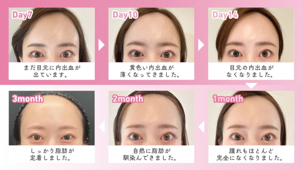 ここでは、実際にじゅうま先生で脂肪注入を受けられたお客様のダウンタイム経過を翌日から3ヶ月目まで解説します。