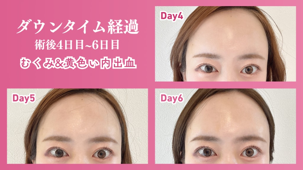 - 症状:4日目~5日目はまだむくみ感や内出血があることが多いです。内出血が青みが勝っているものから、黄色っぽい内出血に変わってきます。施術後5日目~6日目あたりで腫れ感が一気にスッキリする方も。痛みや違和感も少なくなり、鎮痛薬がなくても過ごせる方がほとんどです。