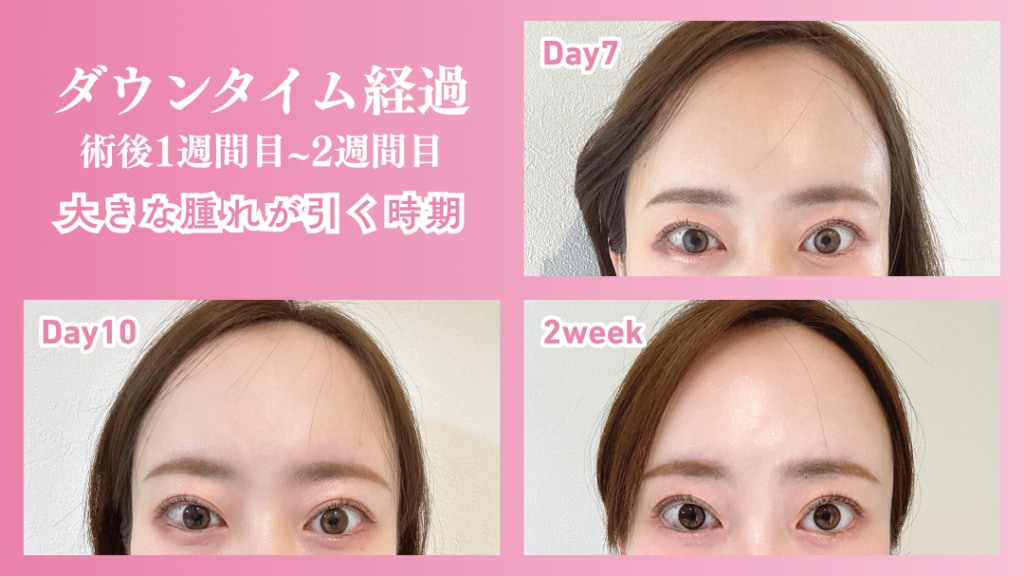 - 症状:大きな腫れやむくみは、この1週間で急速に引いていきます。腫れが強い方も、2週間目あたりにはほとんど腫れや内出血が治っていることが多いです。