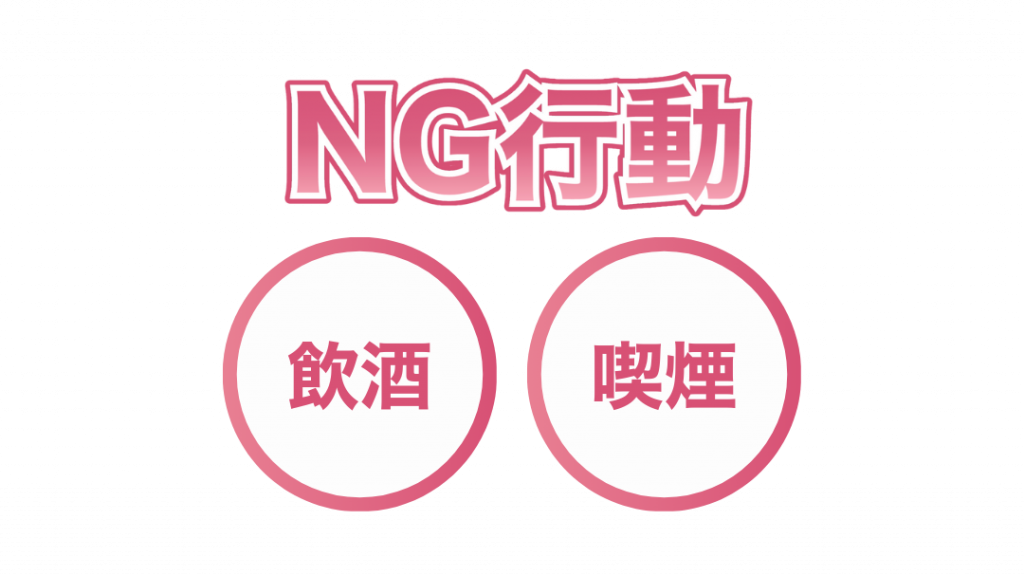 - NG行動:お酒、タバコ。