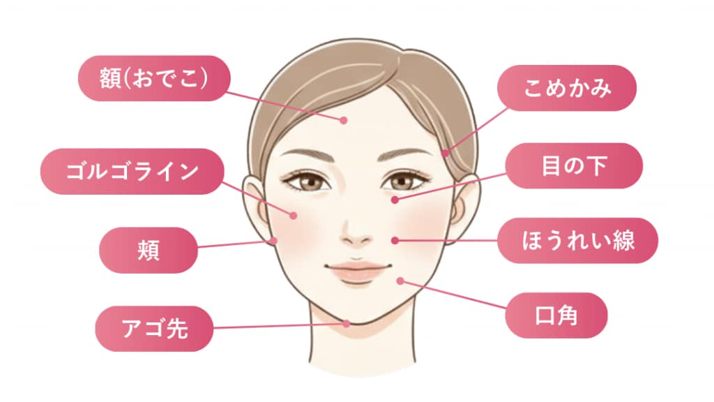 表情の動きが激しい部位。笑った時の不自然な膨らみを防ぎつつ、加齢によるコケをふっくらと埋めることで、定着を最大化させながら若返りを叶えます。 - 顎先(あご)