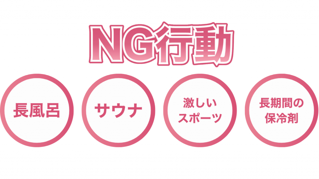 - NG行動: 長風呂、サウナ、激しいスポーツ、または保冷剤での長時間の冷却。