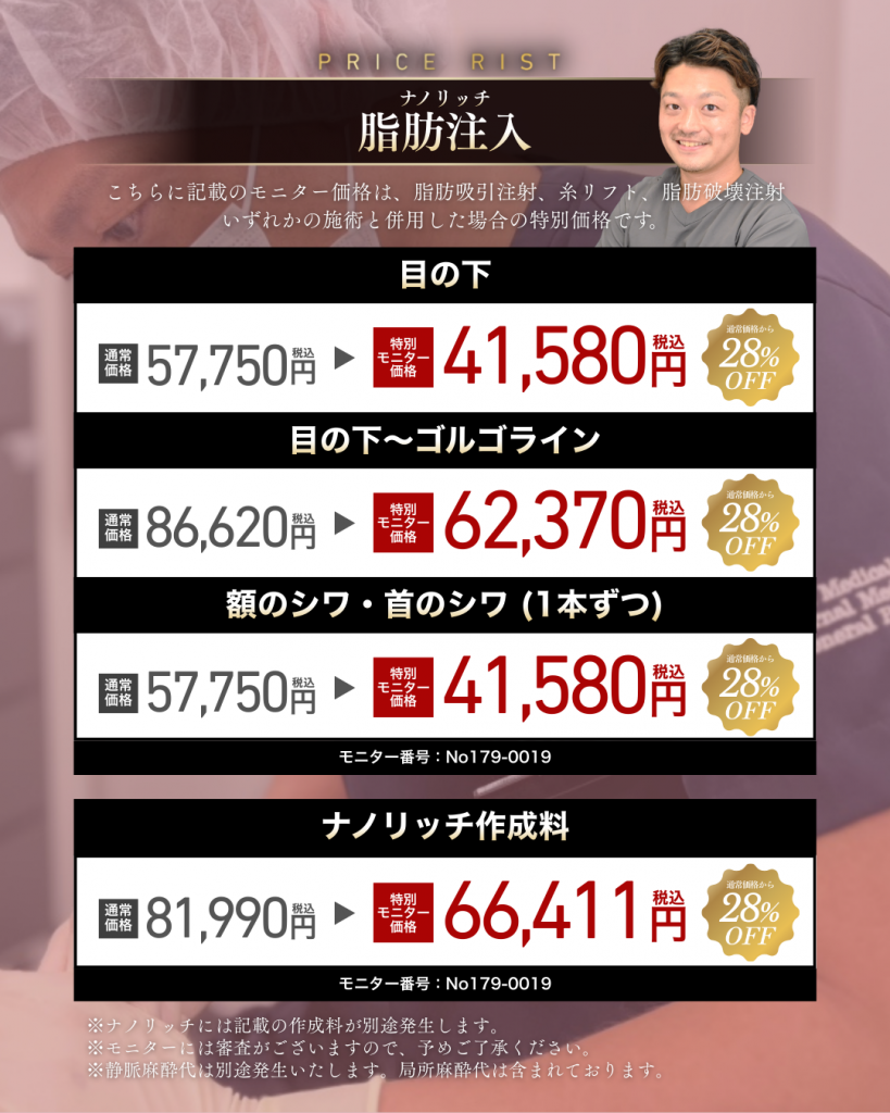 加藤重磨先生の強みは、単に脂肪を入れるだけでなく、通常の脂肪注入と、より微細で滑らかな仕上がりを叶える「ナノリッチ」を部位ごとに緻密に使い分ける提案力にあります。
