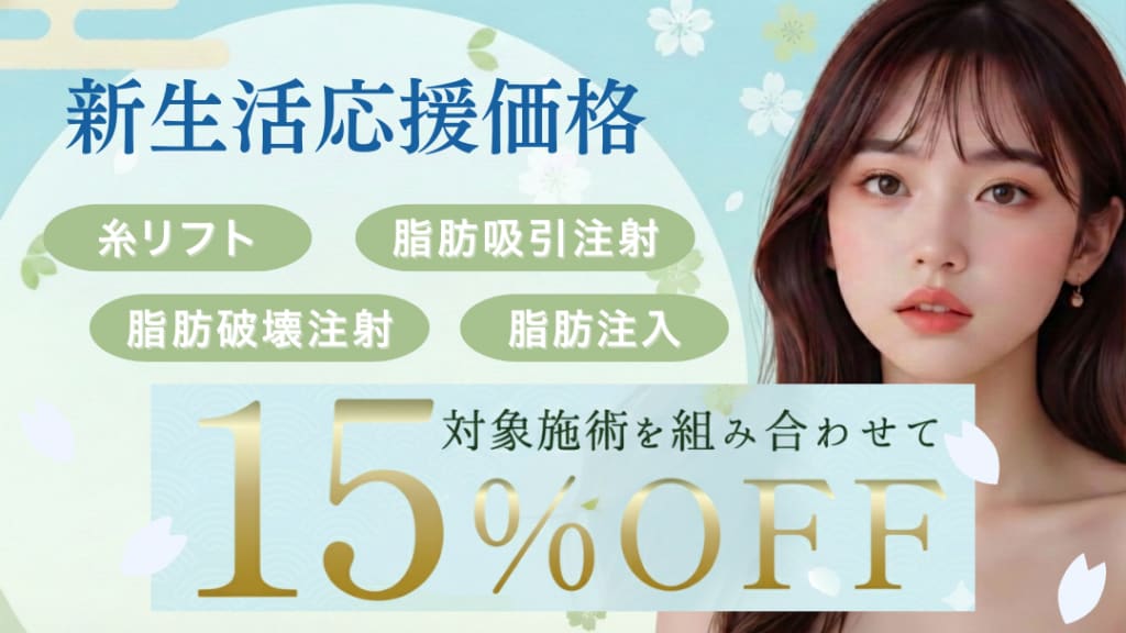 (例:脂肪注入(モニター価格)+糸リフト(モニター価格) = どちらもモニター価格から10%OFF!) - ルール③ 脂肪破壊注射15%OFF