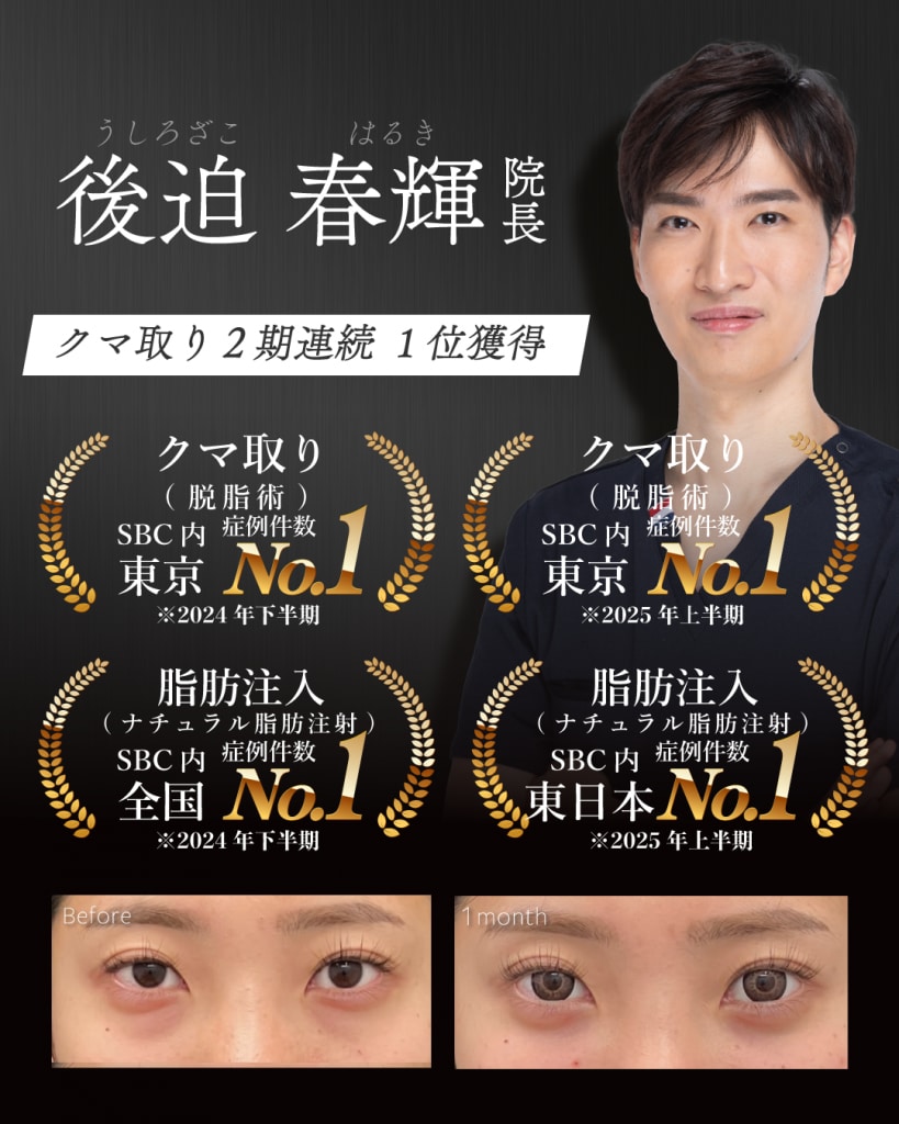 湘南美容クリニック内では東京都内でクマ取り(脱脂術)のSBC内症例数ランキング1位を獲得(2024下半期・2025上半期)しており、豊富な症例数と確かな技術力で信頼を集めています。