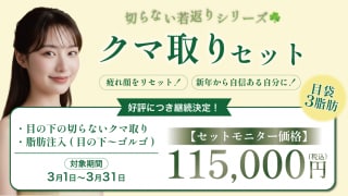 クマ取り 【クマ取りが23%OFF!】イテウォン限定キャンペーン!「自然な若返り」を手に入れる! クマ取りと脂肪注入のキャンペーンが登場!セット価格でお得に受けられるチャンス!目の下のクマが気になる・老け顔・疲れ顔にお悩みの方には超お得な内容です! 2026.02.28 クマ取り全院共通脂肪注入