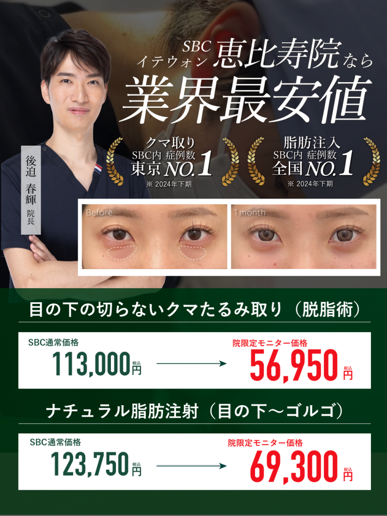 イテウォン恵比寿院では、クマ取りや脂肪注入などSBCのなかでも最安値のメニューを多くご用意しています。予算でお悩みの方も、後迫医師はできる限り寄り添った提案を必ずしてくれます